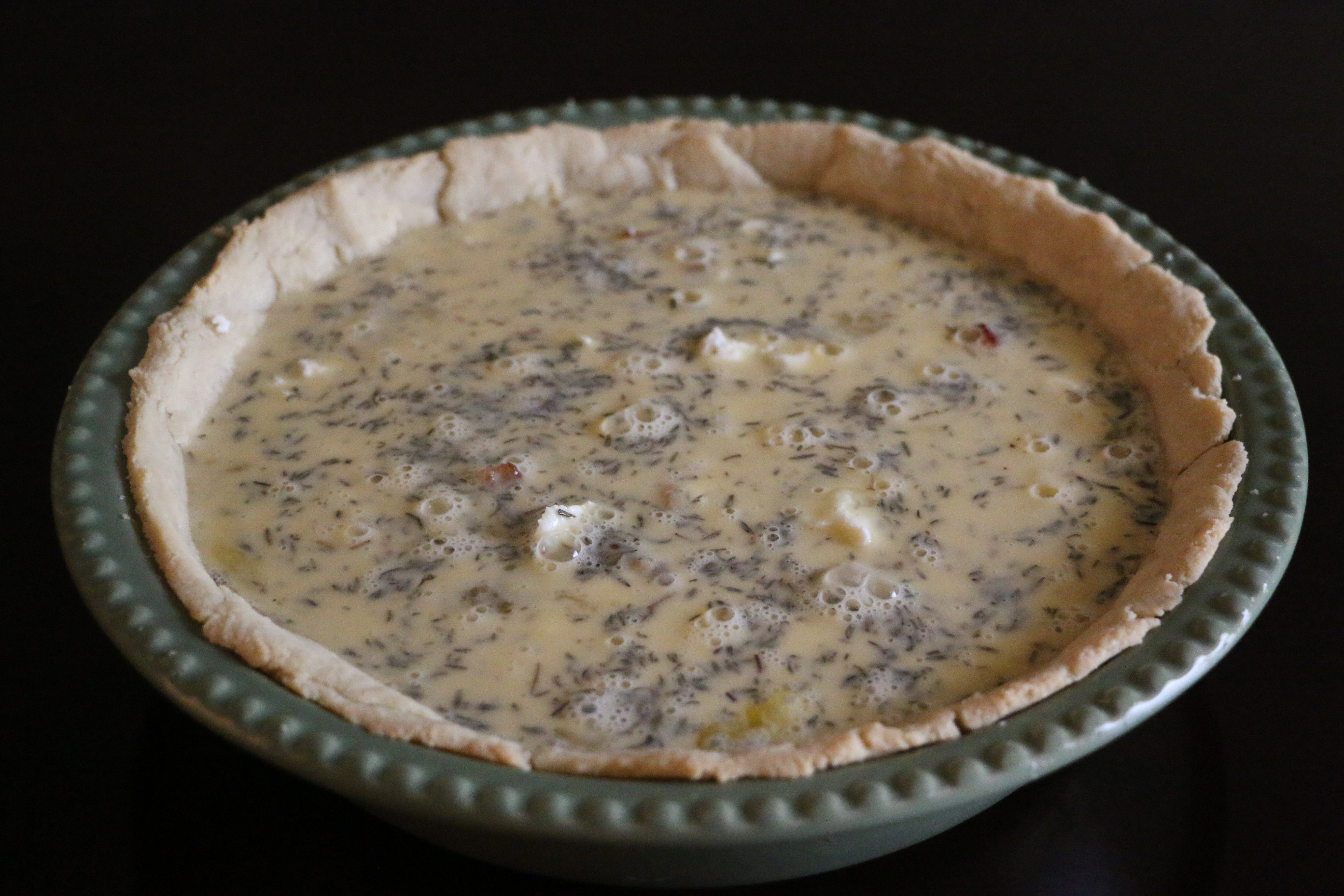 In the bottom of the pre-made pie crust, add the caramelized onions. Then add the chopped bacon. Finally, sprinkle on the goat cheese.